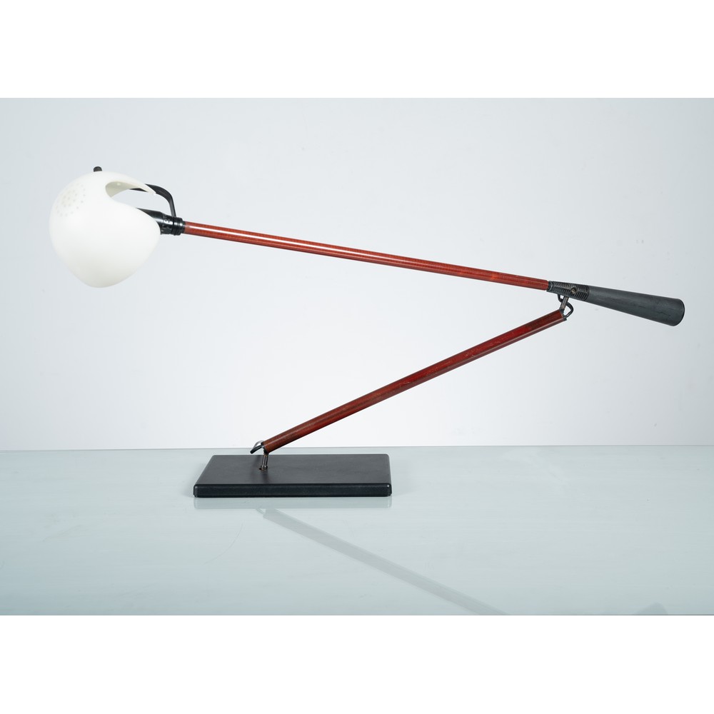 Lampada da tavolo reclinabile modello “613 ” una luce, struttura in carbonio, metallo pressofuso e plastica, diffusore semi sferico in fibra di vetro.