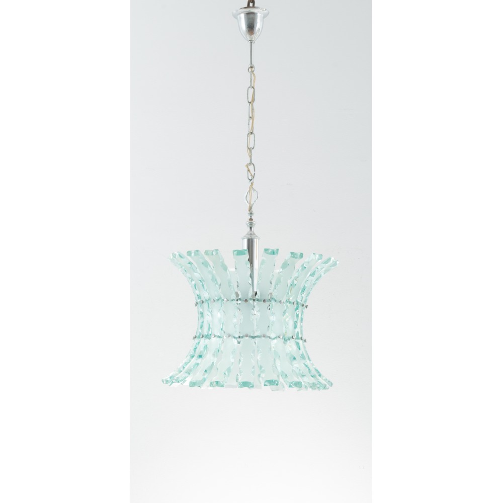 Lampada a sospensione ad una luce, struttura in metallo cromato, diffusore formato da grossi elementi curvi in vetro verde Nilo tagliati a scalpello.