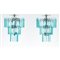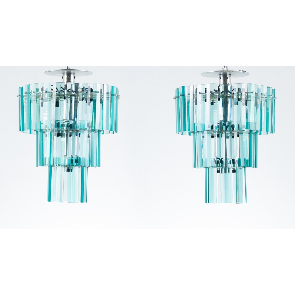 Coppia di lampade a sospensione a quattordici luci, struttura in metallo cromato, corpo circolare composto da tre anelli decrescenti, diffusore formato da elementi in vetro azzurrino. Sbeccature.