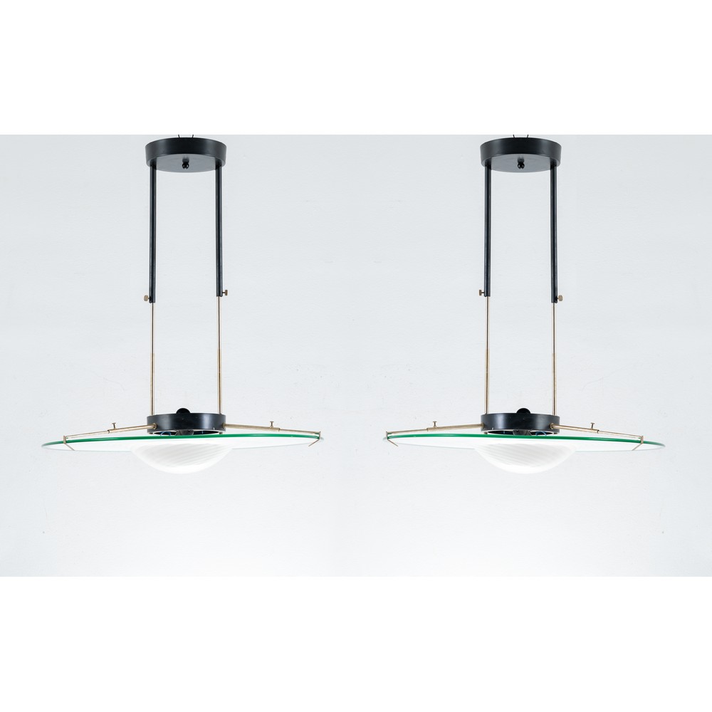 Coppia di lampade a sospensione ad una luce, struttura in metallo verniciato nero e metallo cromato estendibile, diffusore a cappello circolare in vetro lattimo a spirale e bordato in verde, convessità centrale.