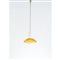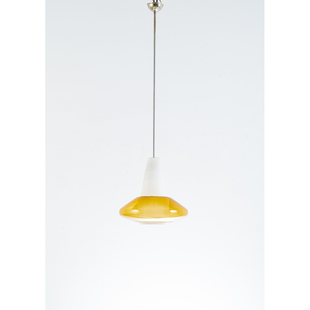 Lampada da soffitto ad una luce, struttura in tubolare di acciaio cromato, diffusore conico in vetro lattimo con anello inferiore in vetro giallo.