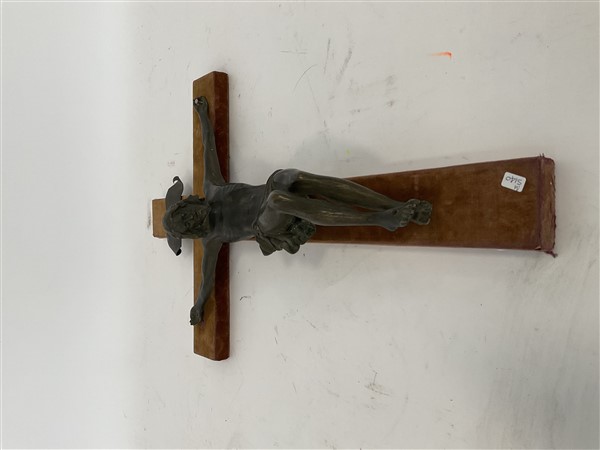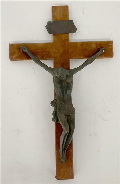 Scultore del secolo XIX. Cristo crocifisso, bronzo su croce rivestita in velluto (cm 64x39) (difetti)