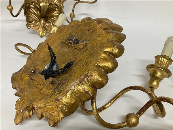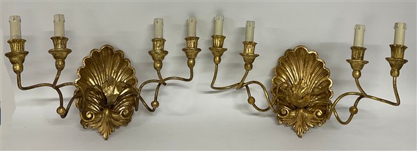 Coppia di applique a quatto luci in legno intagliato e dorato a foggia di valva
