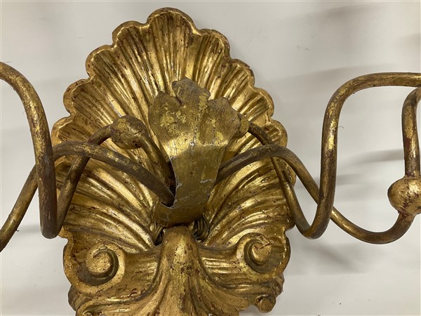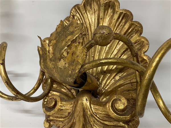 Coppia di applique a quatto luci in legno intagliato e dorato a foggia di valva di conchiglia. Bracci mossi in metallo (L. cm 52) (difetti)