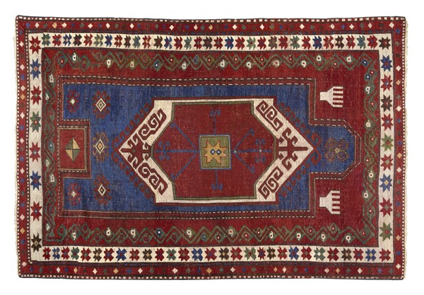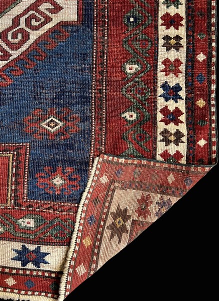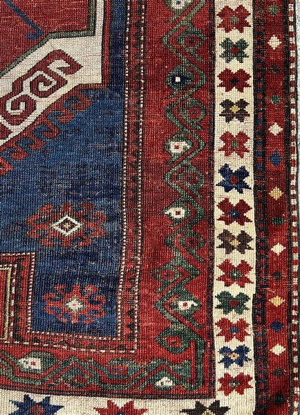 Tappeto Kazak Fachralo, Caucaso, fine secolo XIX. Decoro con medaglione esagonale sopra un Mirab a fondo blu. Bordura a stelle su fondo bianco (cm 187x121) (difetti)