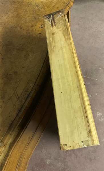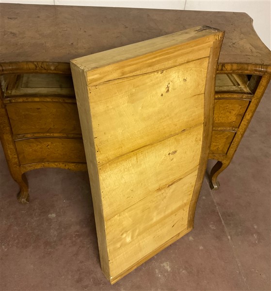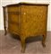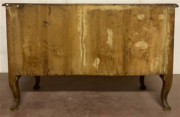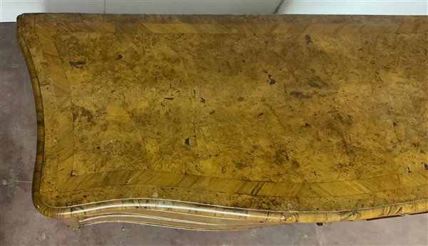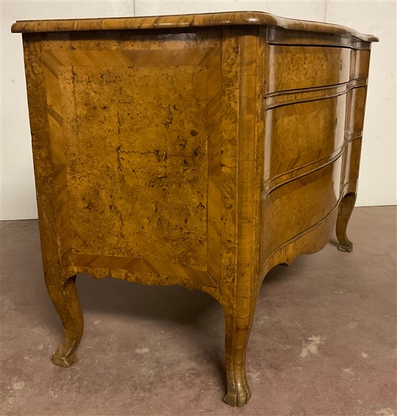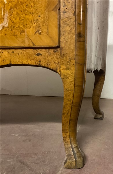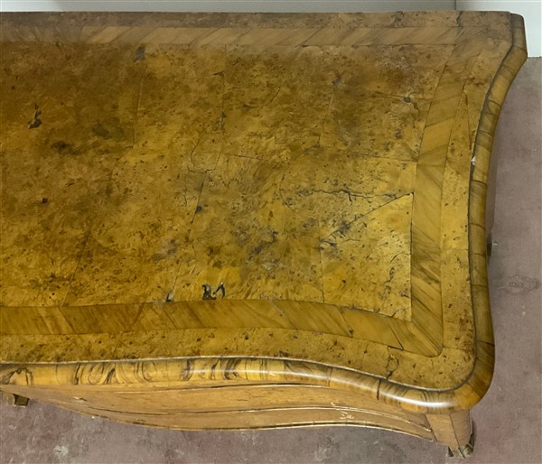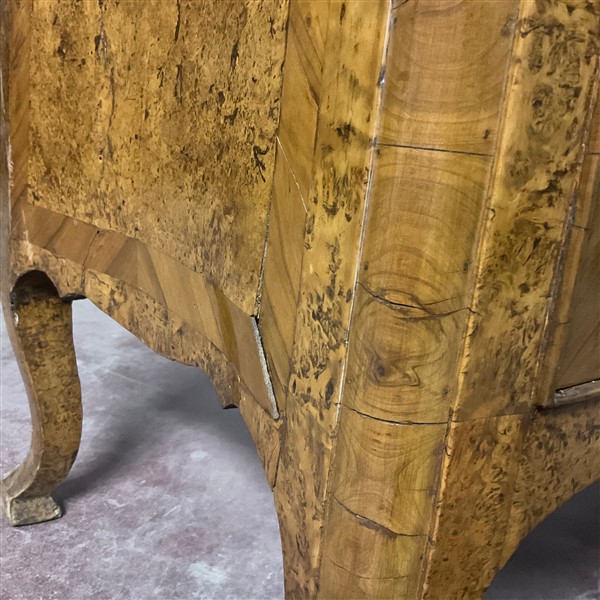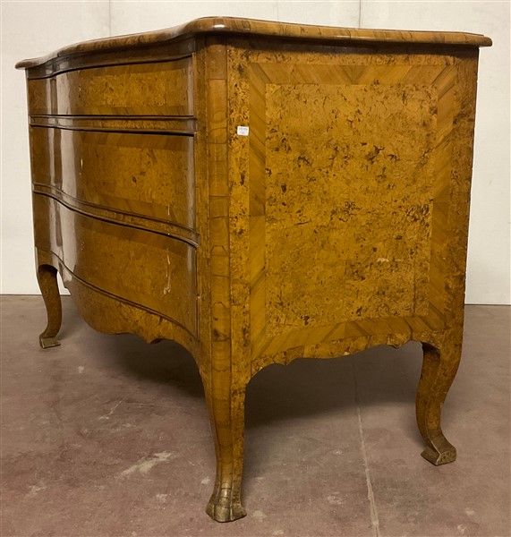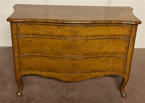Cassettone a balestra lastronato in radica di legni vari a tre cassetti sul fronte. Piano sagomato e gambe mosse. Secolo XVIII (cm 122x92x61) (difetti e restauri)