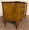 Cassettone a balestra lastronato in radica di legni vari a tre cassetti sul fro