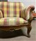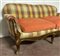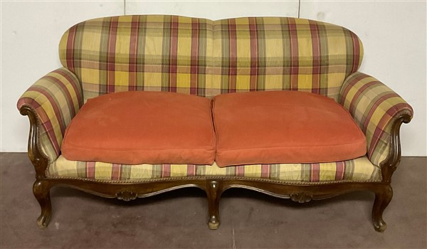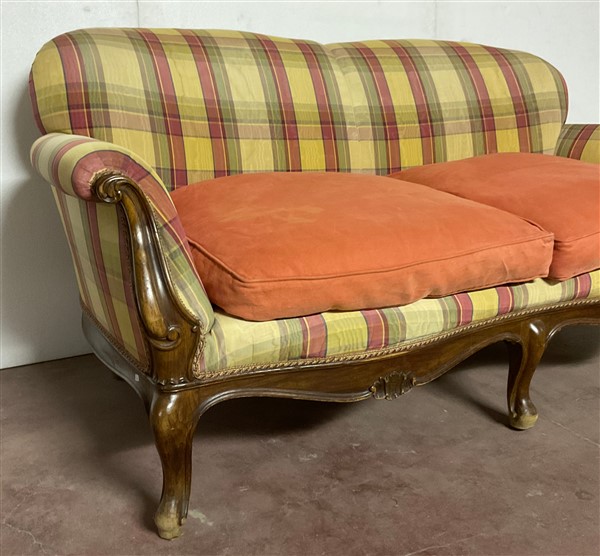 Fornitura da salotto composta da divano e coppia di poltrone in legno intagliato rivestite in tessuto (cm 177x80x88 e 80x82x75) (difetti e poltrone mancanti dei cuscini nelle sedute)