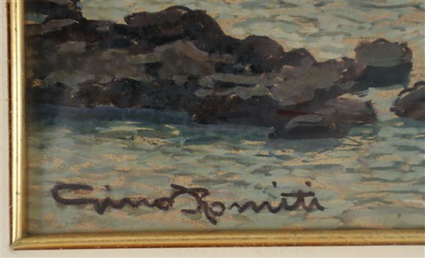 Gino Romiti (Attribuito) "Marina con scogli" olio su faesite (cm 30x40) Firmat