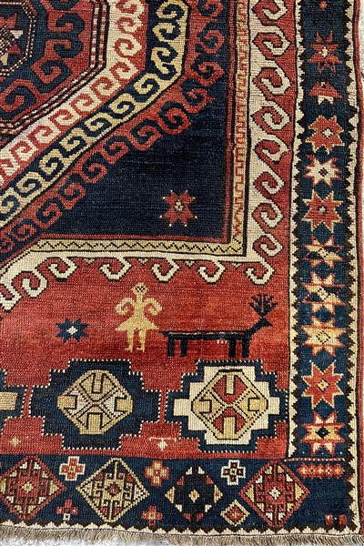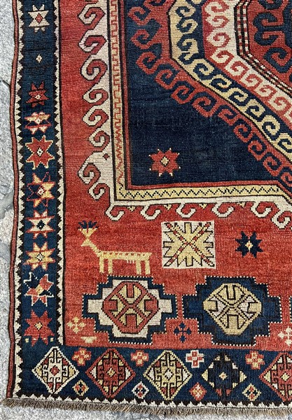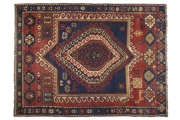 Tappeto Kazak, Caucaso, fine secolo XIX. Decoro con medaglione romboidale su fondo blu con motivo a doppia nicchia (cm 201x157) (difetti)