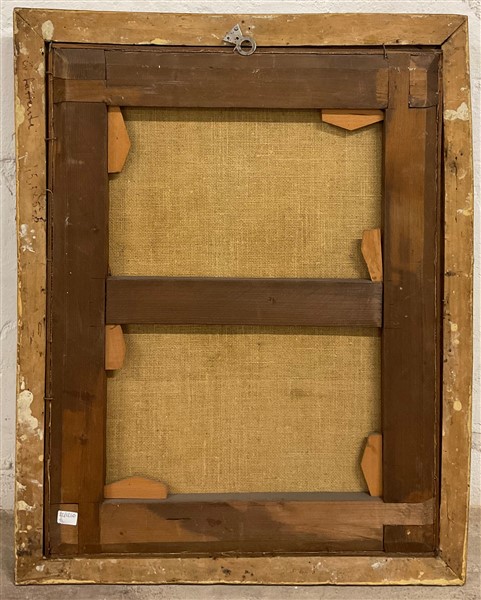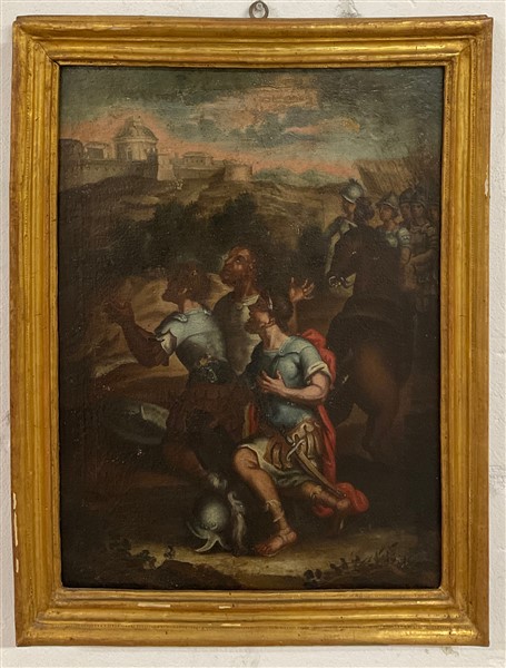 Scuola del XVIII secolo, Scena religiosa con soldati, olio su tela (cm 56x44) In cornice in legno dorato (difetti e restauri) frammento