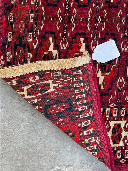 Tappeto Torba Tekkè, Turkestan occidentale, inizio secolo XX. Decoro con file di Gul su fondo bordeaux (cm 114x72) (lievi difetti)