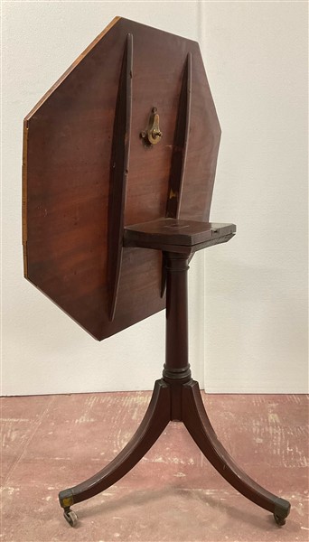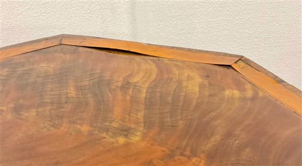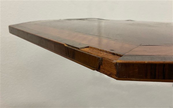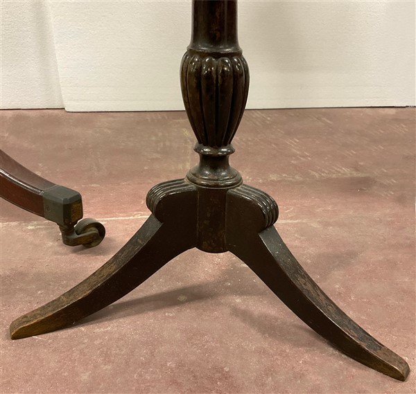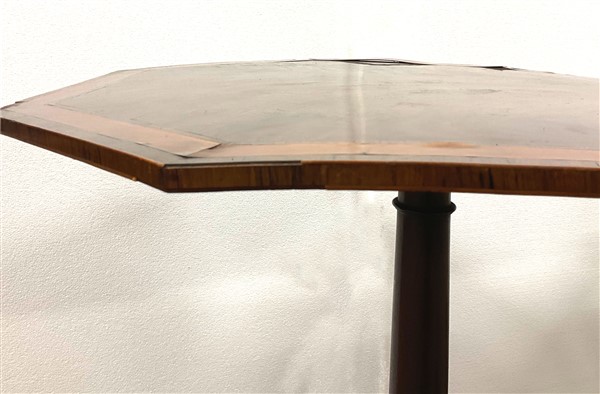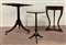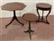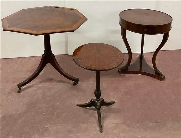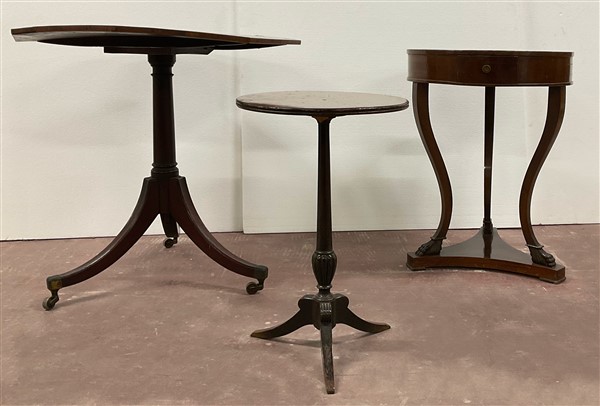 Lotto composto da un tavolino con piano circolare ad un cassetto con sostegno tripode e piedi ferini (d. cm 48x h. cm 64,5), un tavolino a vela con piano ottagonale e sostegno tripode su rotelle (d. cm 68xh. cm 68) ed un gueridon con piano circolare e sostegno tripode (d. cm 35,5xh. cm 55). Epoche differenti (difetti)