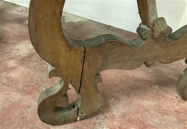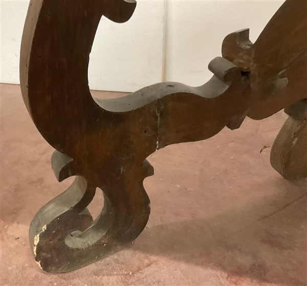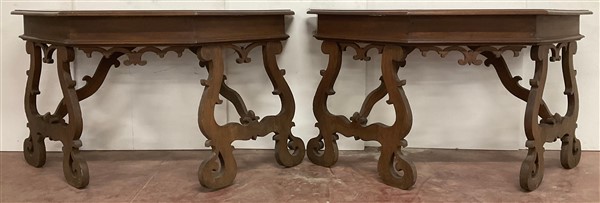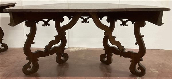 Coppia di console sagomate con gambe a lira riunite da traverse formanti tavolo ottagonale, secolo XVII - XVIII (cm 144x84x72) (difetti)