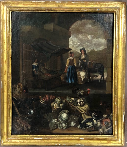 Bambocciante attivo in Italia nel secolo XVII "Scena di mercato" olio su tela