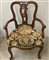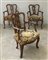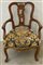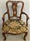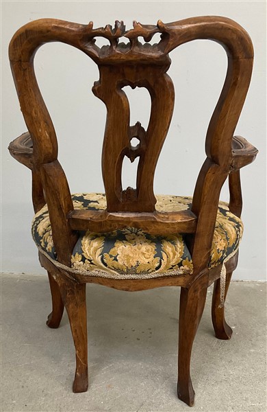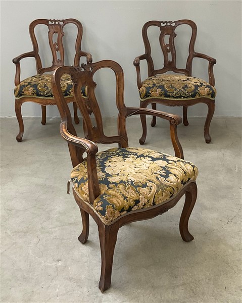 Tre antiche poltrone in legno intagliato, schienale centrato da cartella sagoma