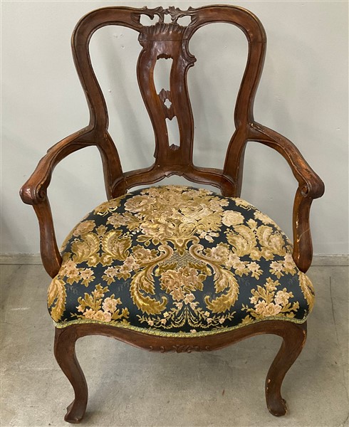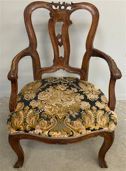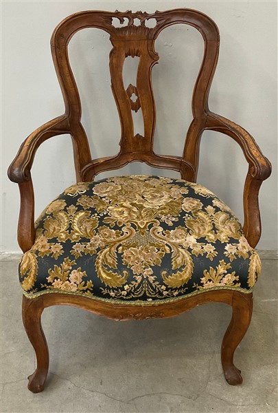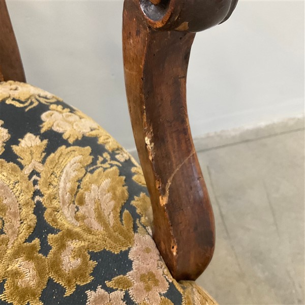 Tre antiche poltrone in legno intagliato, schienale centrato da cartella sagomata e traforata, braccioli terminanti a ricciolo, gambe mosse (difetti e restauri)
