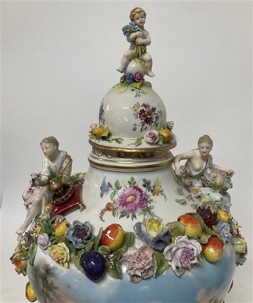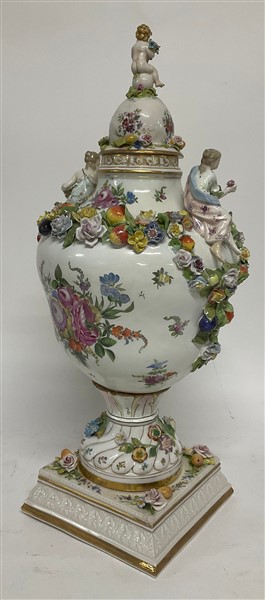 Manifattura tedesca, secolo XIX - XX. Vaso con coperchio in porcellana dipinta in policromia a balaustro biansato e cimato da figure, decoro con scena biblica entro riserva e fiori a rilievo (cm 30x h 64) (difetti, restauri e coperchio incollato)