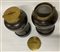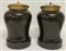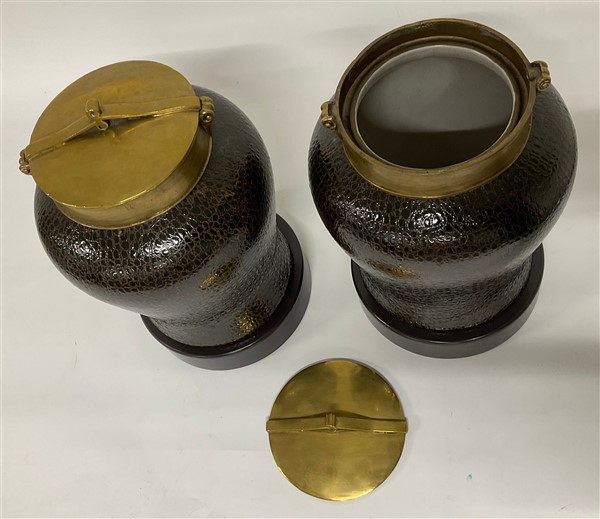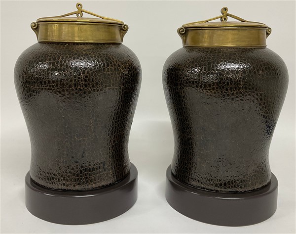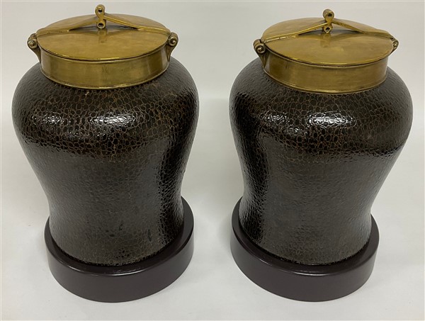 Coppia di vasi in porcellana con superfice a finto coccodrillo e coperchio in ottone, basi in legno