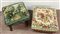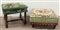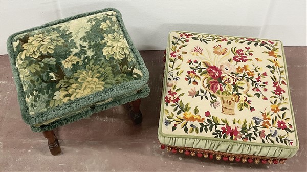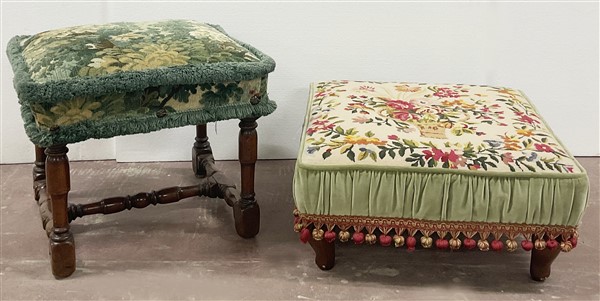 Lotto composto da un poggiapiedi e un panchetto in legno intagliato con gambe tornite unite da traverse, rivestiti in tessuto, di misure e decori differenti (difetti)