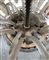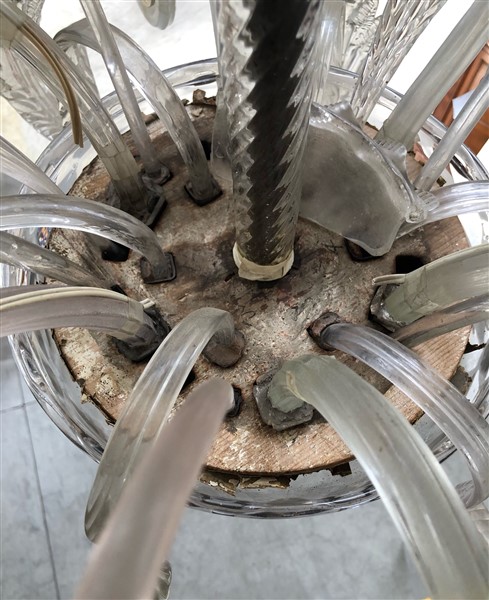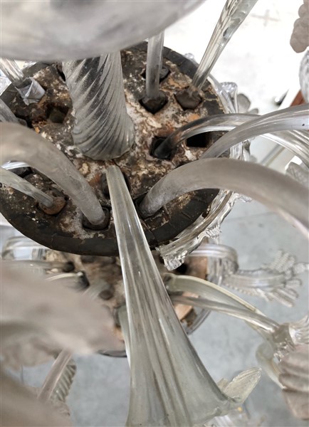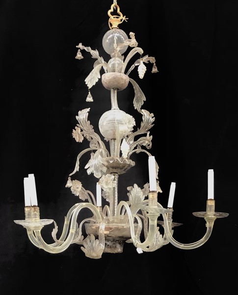 Manifattura di Murano. Lampadario in vetro a sei bracci e decorazioni a foglie e fiori su più ordini (d. cm 90 h. cm 110 circa) (gravi danni e mancanze)