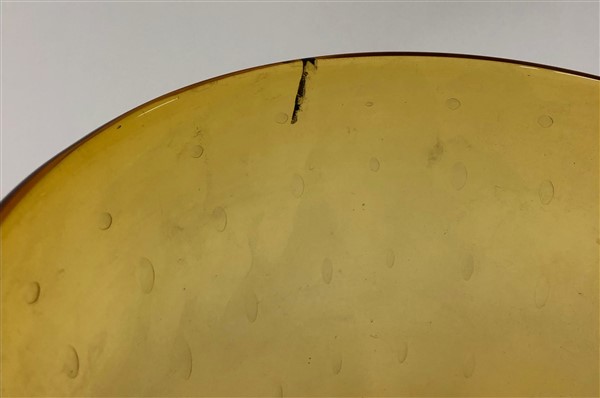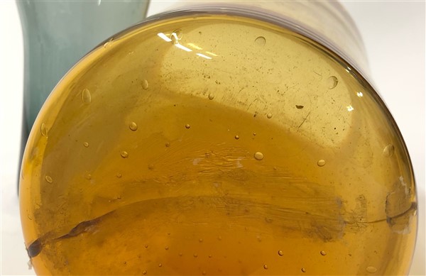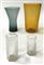 Lotto composto da un vaso in vetro trasparente fumè recante etichetta WMF Krystal, Germany, un vaso in vetro trasparente color ambra con decoro a bolle e due vasetti a sezione esagonale in vetro trasparente incolore. (h max cm 35) (difetti)