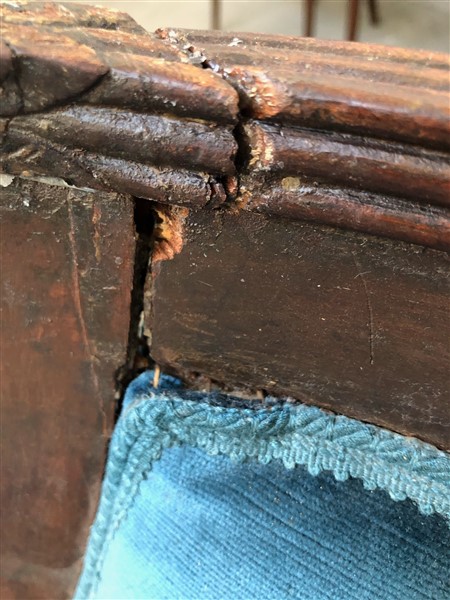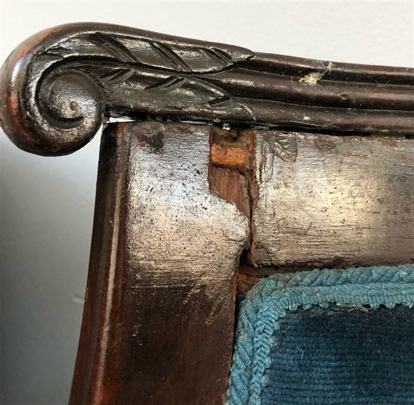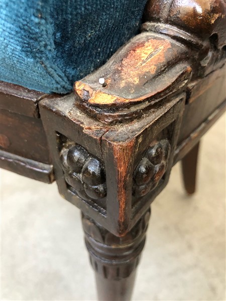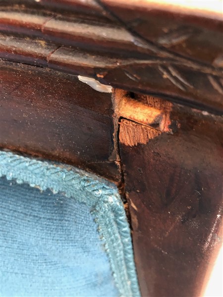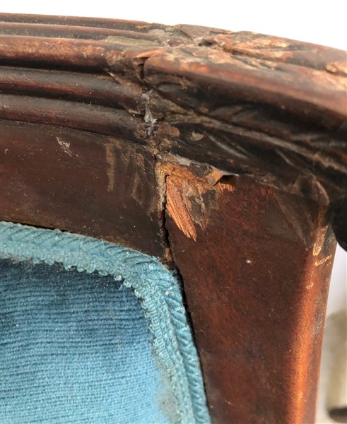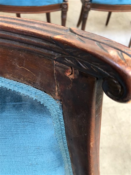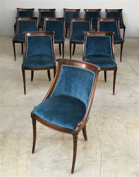 Dodici sedie a gondolle in legno tinto, montanti terminanti a collo di cigno con motivo di rosetta all'attacco, gambe a sciabola (gravi danni e mancanze)