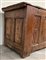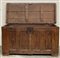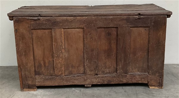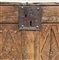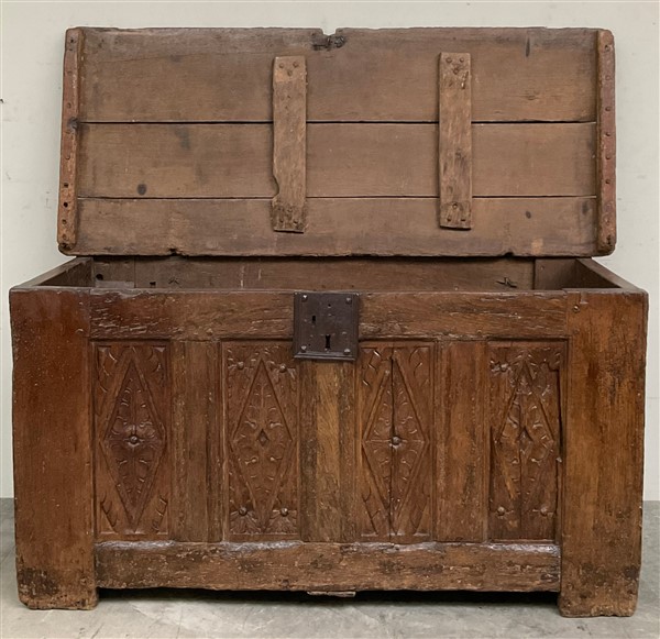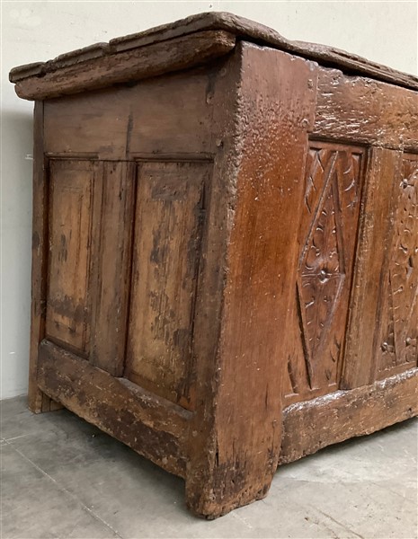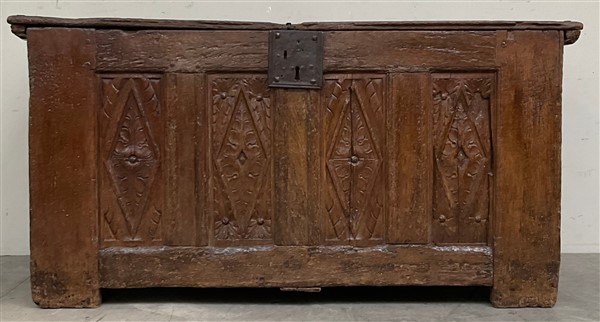 Antico cassone francese decorato sul fronte da quattro pannelli intagliati a mo