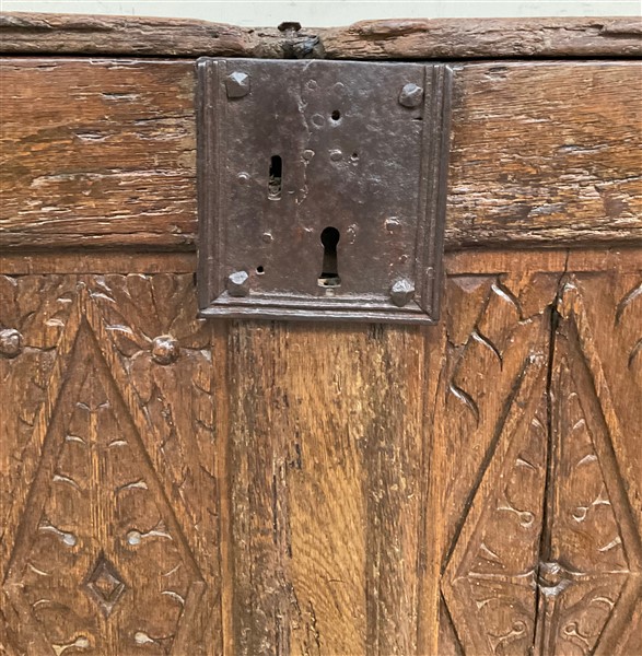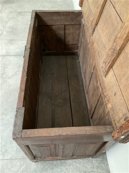 Antico cassone francese decorato sul fronte da quattro pannelli intagliati a motivi gotici. Copri serratura in ferro battuto (cm 170x86x70) (difetti)