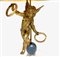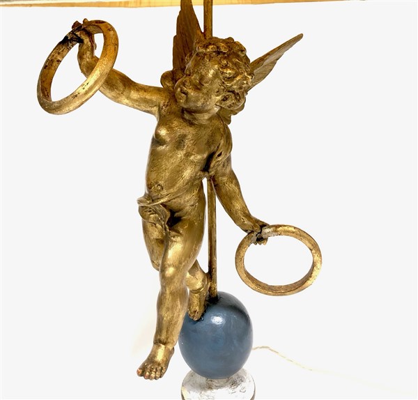 Lampada da tavolo in legno intagliato, dipinto e dorato. Fusto a foggia di putto alato a tutto tondo poggiante su globo (h. cm 65) Elettrificata in epoca posteriore (difetti)