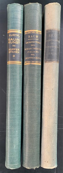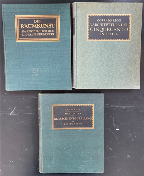 Autori diversi. Architettura del 500 in Italia, Architettura del Rinascimento italiano e di Raumkunst. Tre volumi riccamente illustrati dell'inizio del sec. XX. Legatura editoriale in tela impressa in oro