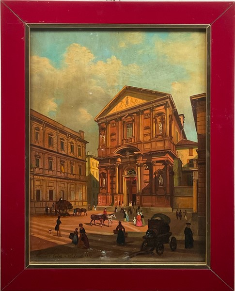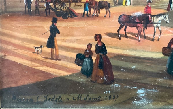 Scuola lombarda del XX secolo "Piazza San Fedele a Milano, 1837" olio su comp