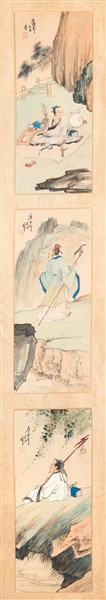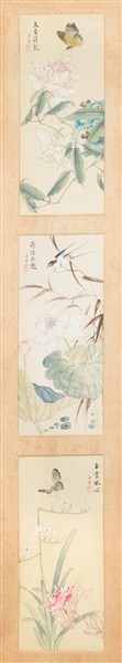 Six paintings on paper depicting flowers birds and figures in landscapes