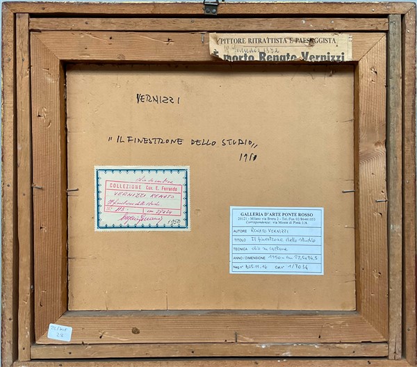 "Il finestrone dello studio" 1950, olio su cartone (cm 24x28,5) Firmato e datato in basso a destra. Al retro: firmato, datato, titolato e cartigli. In cornice