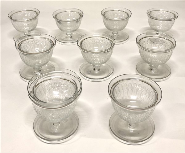Nove coppe da caviale in cristallo e vetro inciso a motivo stilizzato e profilo dorato (lievi difetti)