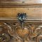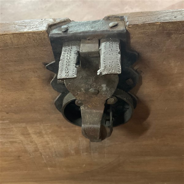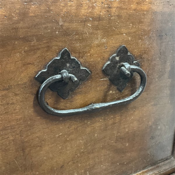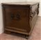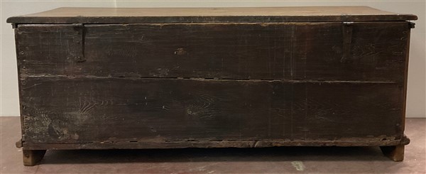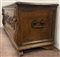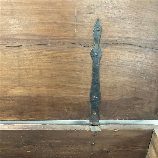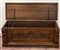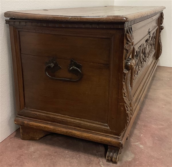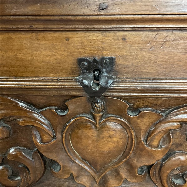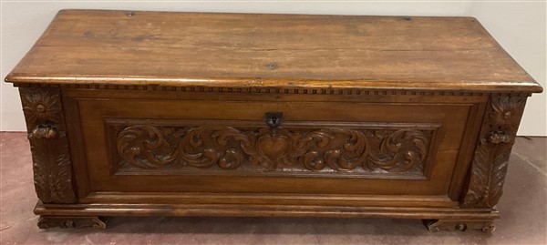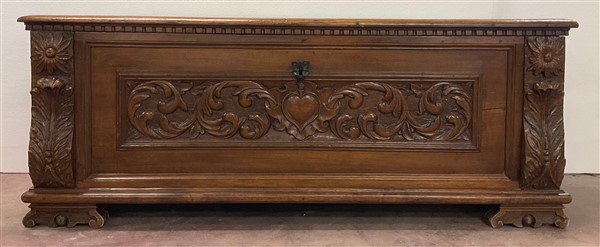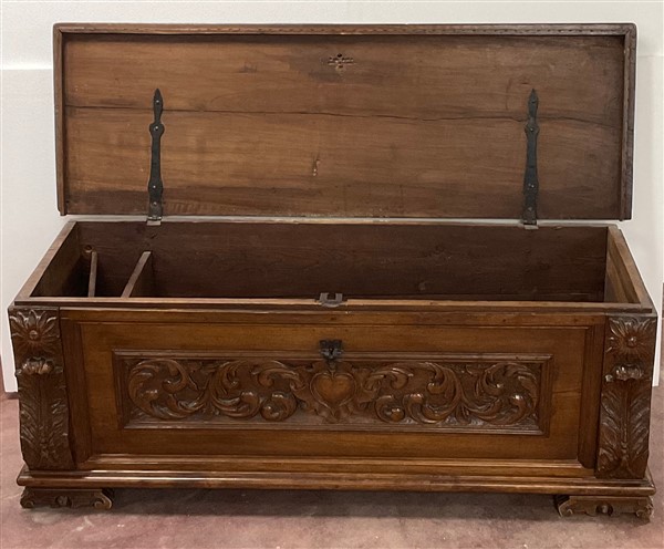 Antica cassapanca in noce con fronte pannellato e intagliato a cuore e volute f
