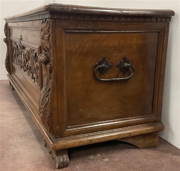 Antica cassapanca in noce con fronte pannellato e intagliato a cuore e volute fogliate, montanti a rilievo a foglie a rosetta (cm 167x64,5x56) (difetti e restauri)