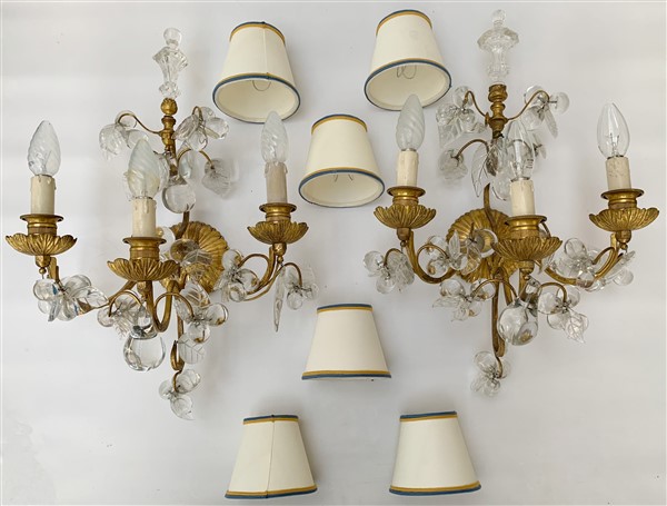 Coppia di appliques in metallo dorato a tre bracci con pendenti a frutti e foglie in vetro, finale a balaustro
