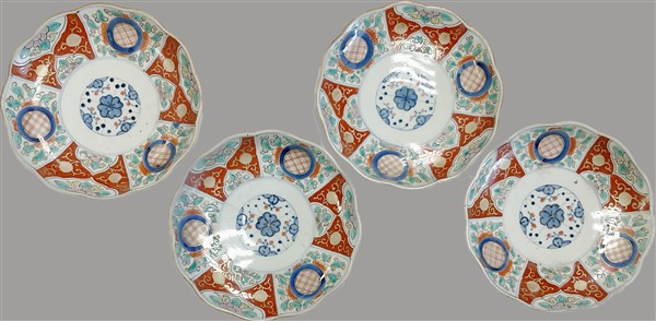 Quattro piatti in porcellana policroma Giappone, secolo XIX-XX (d. cm 22,5) (d