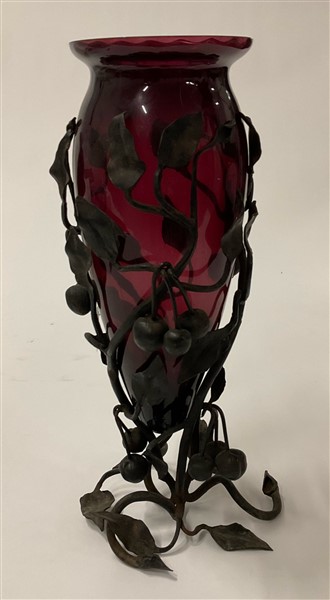 Lot 1346 | Vaso in vetro soffiato color vinaccia entro struttura con rami e frutti di cili