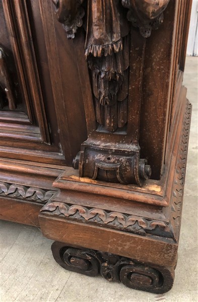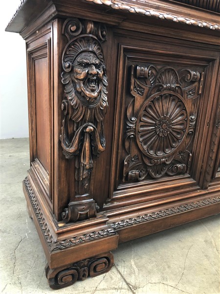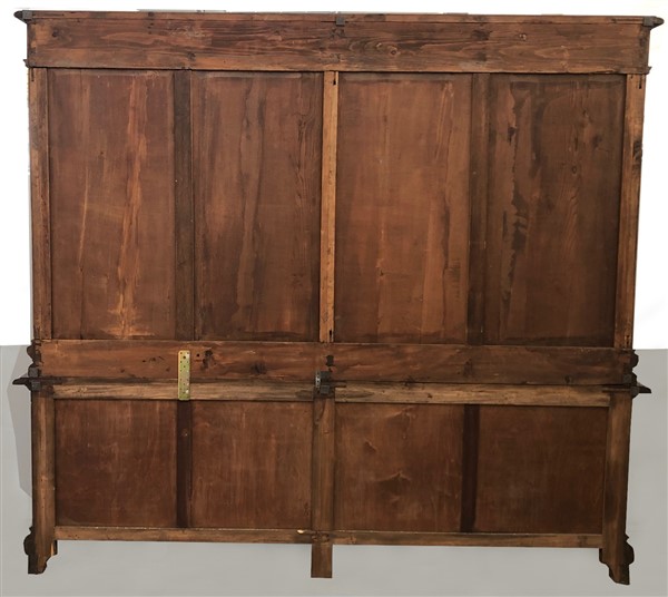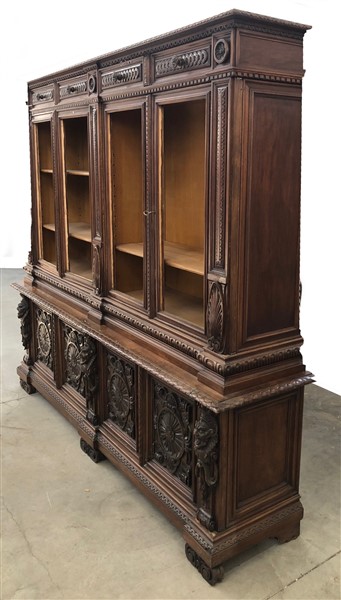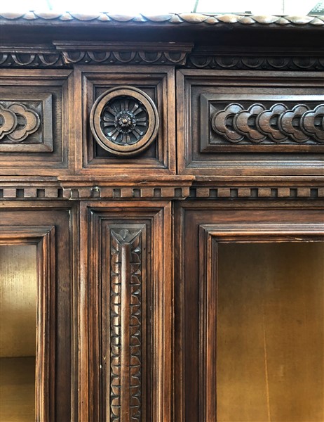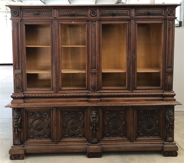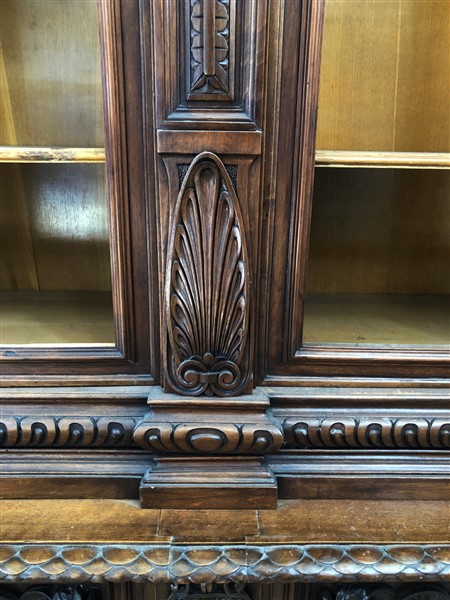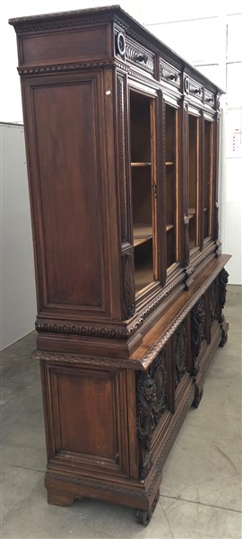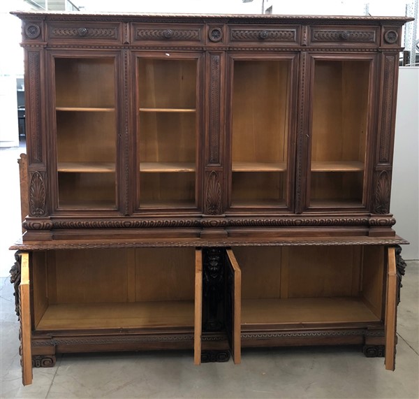 Libreria a due corpi di gusto neorinascimentale a quattro ante e quattro cassetti. Inizio secolo XX (cm 227x200x50) (difetti)