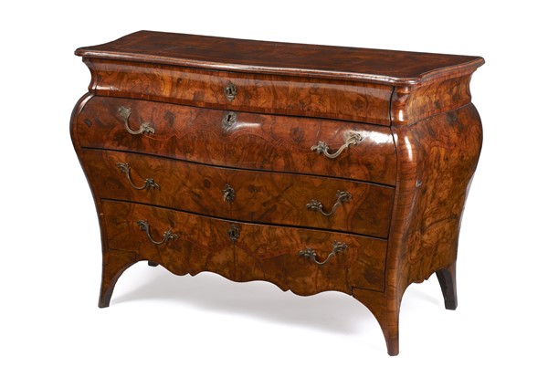 Comò di forma bombata, lastronato in radica e filettato in bois de rose e bosso con tre cassetti sotto uno a mezza lunghezza sul fronte. Lombardia, secolo XVIII (cm 130x88x60) (restauri)