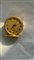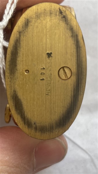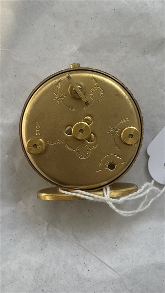 Jaeger LeCoultre, Orologio da viaggio con cassa in ottone dorato di forma rotonda, con quadrante dorato e numeri romani stampati, 5 x4,5 cm. (lievi difetti)