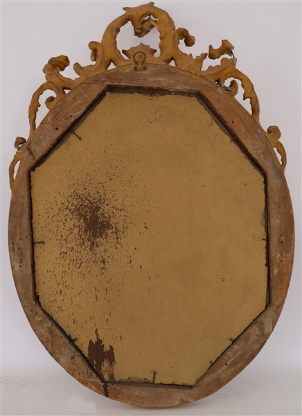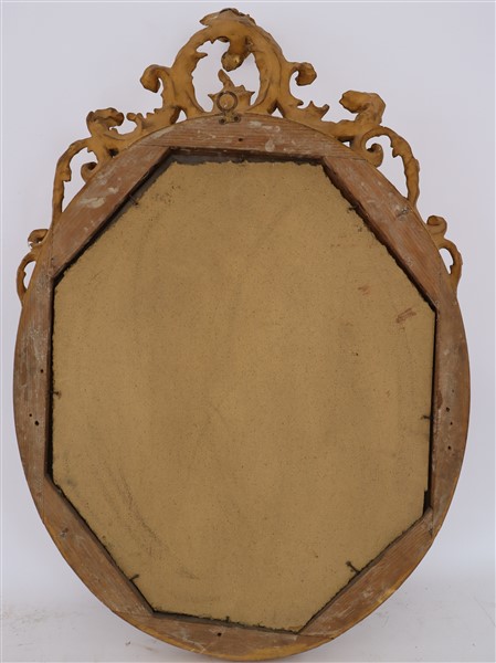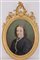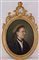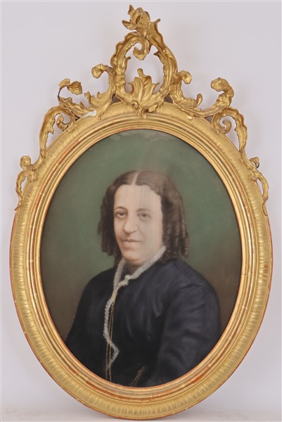 Coppia di cornici ovali in legno intagliato e dorato a volute e cimasa del sec XIX contenenti due ritratti a pastelli (cm 70x55)