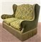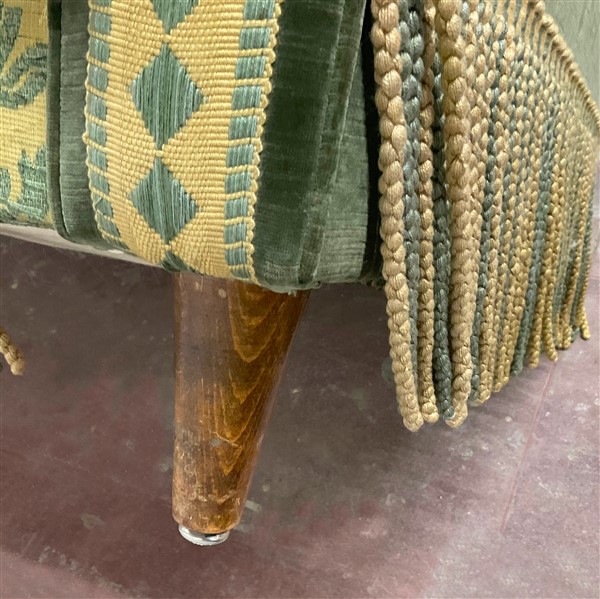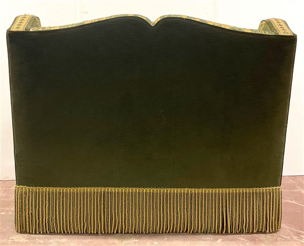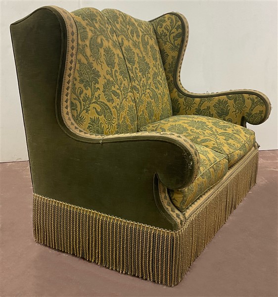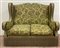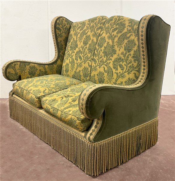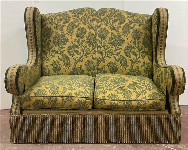 Divano a due posti con schienale e braccioli di forma mossa, imbottito e rivestito in tessuto decorato a motivo jacquard di recente manifattura (141,5x111x86) (difetti)