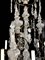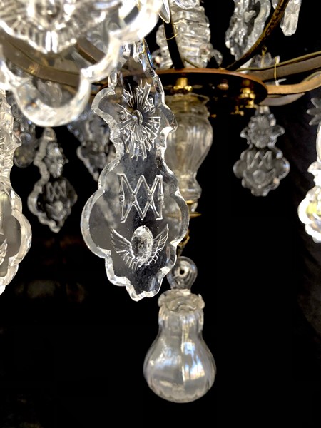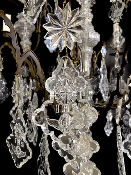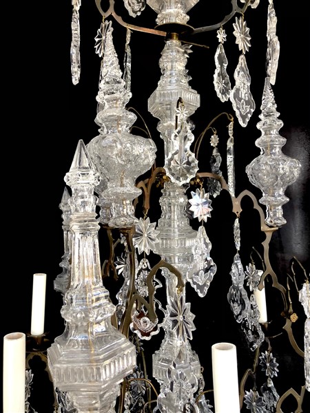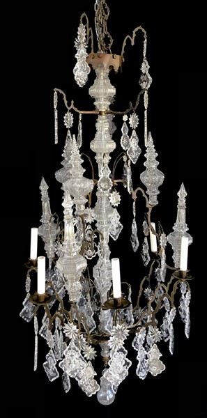 Lampadario a nove luci in metallo, pinnacoli e gocce in vetro (h cm 130)