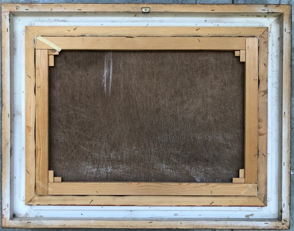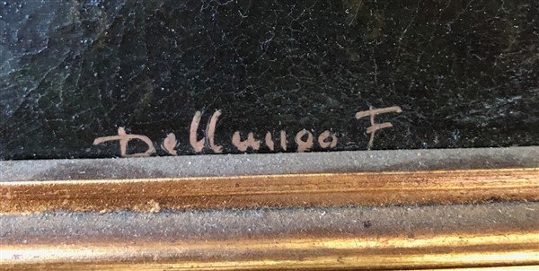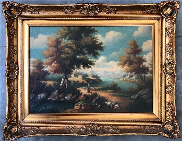 Ignoto, dipinto ad olio su tela raffigurante paesaggio con figure, (cm 50x70) firmato in basso a destra, in cornice dell'epoca (difetti)