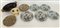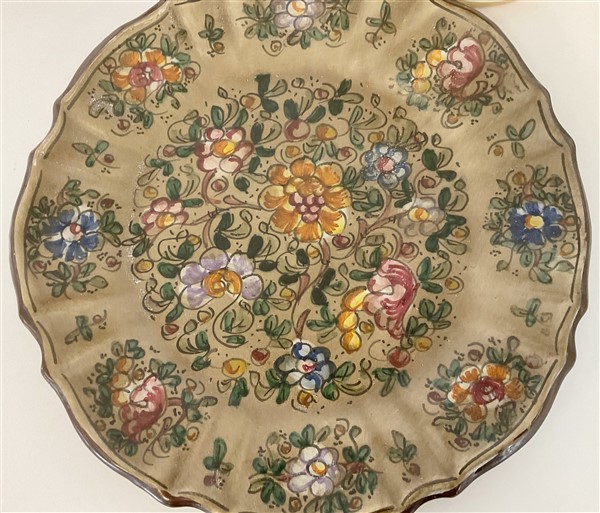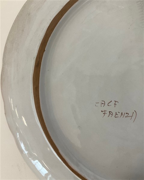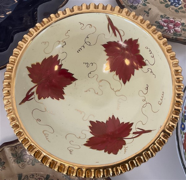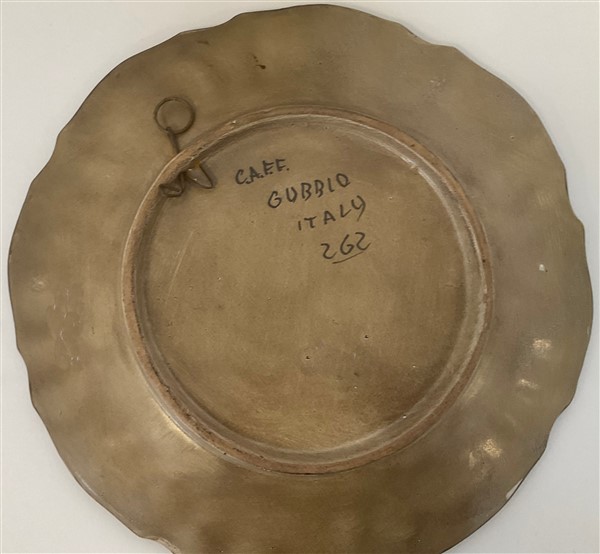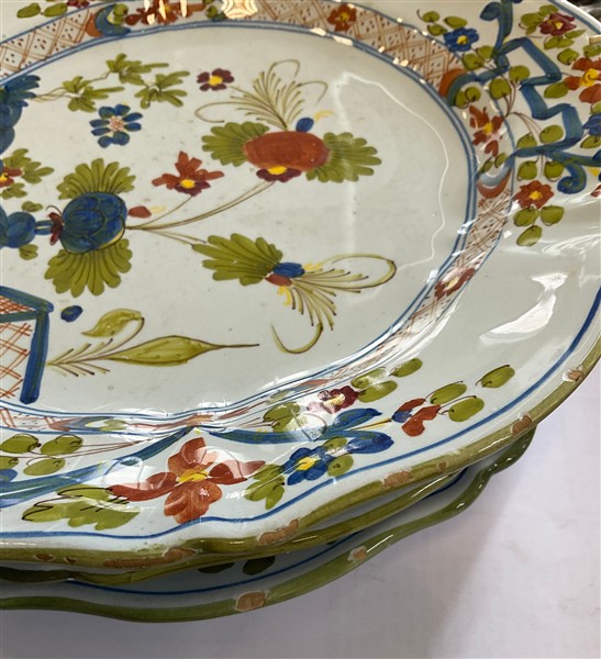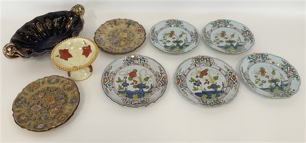 Lotto in ceramica di manifatture differenti, composto da due centrotavola con decori in oro marcati Deruta, tre piatti con decoro al garofano marcati Imola e due di analogo decoro di cui uno marcato Faenza e due piatti a decoro floreale marcati Gubbio (L max cm 43) (difetti)