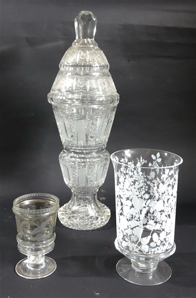 Una potiche con coperchio in cristallo molato unita a due vasi in vetro inciso di diverso decoro (h. max cm 69).