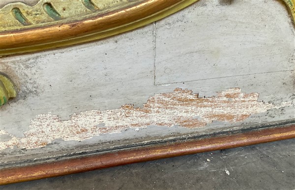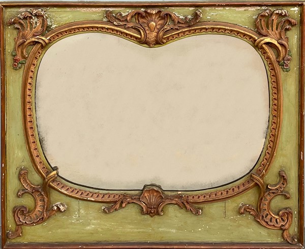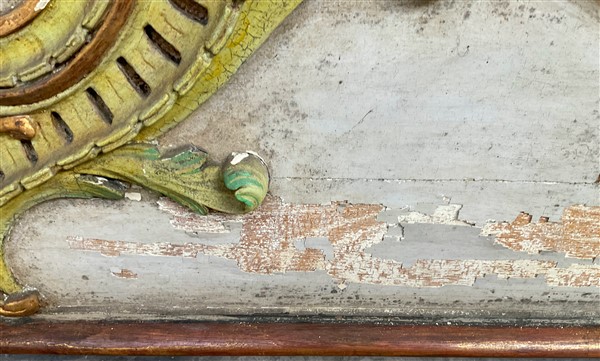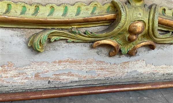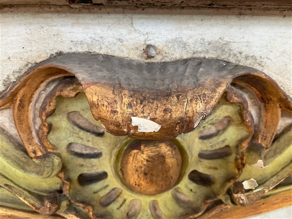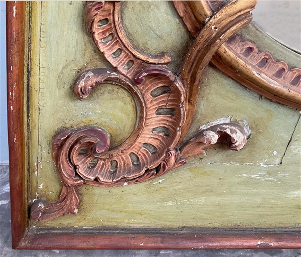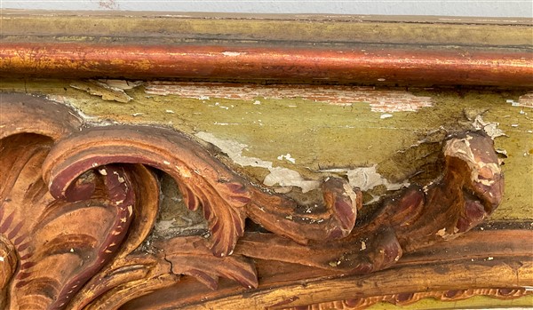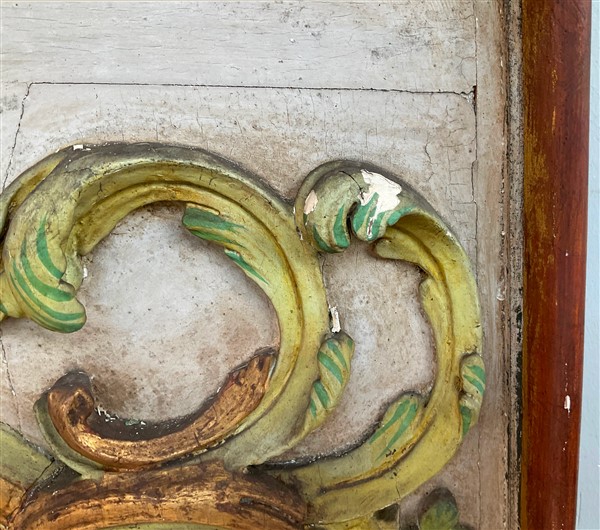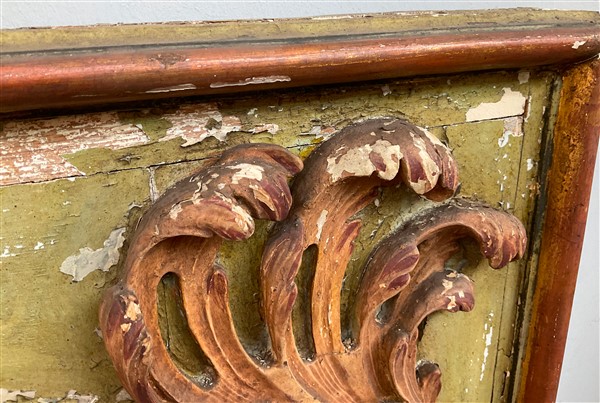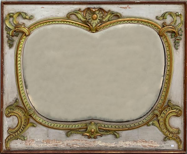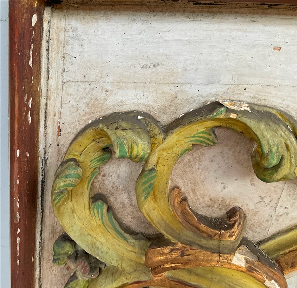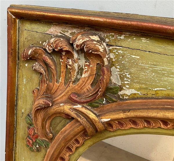 Coppia di antiche specchiere intagliate e laccate con decoro a volute e fiori (cm 158x125) (difetti)
